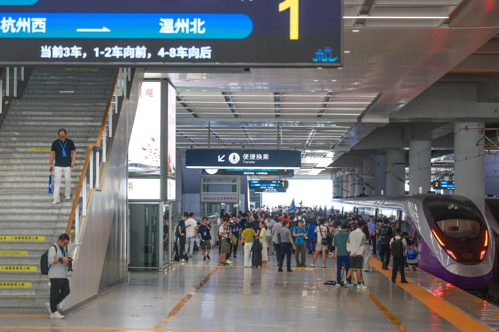 9月6日,從杭州西站開出的首發(fā)列車抵達(dá)溫州北站。新華社記者 江漢 攝