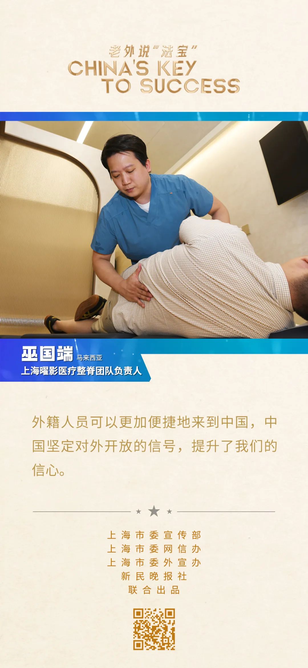 馬來西亞人巫國端是上海曜影醫(yī)療整脊團(tuán)隊(duì)負(fù)責(zé)人。2014年,他只身來到上海從事醫(yī)療工作,今年是他在這座城市的第十個(gè)年頭。
