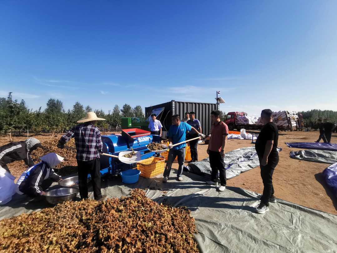 工作人員正在進(jìn)行榛子脫皮。(通訊員 白玉亮攝)