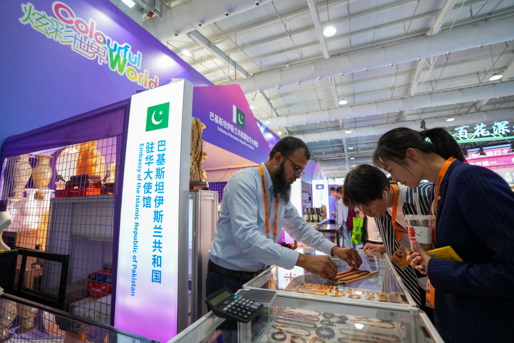 9月12日,在服貿(mào)會(huì)首鋼園區(qū)的炫彩世界——‘一帶一路’沿線國家特色文化展示活動(dòng)上,參觀者在巴基斯坦伊斯蘭共和國駐華大使館展區(qū)選購商品。新華社記者 鞠煥宗 攝