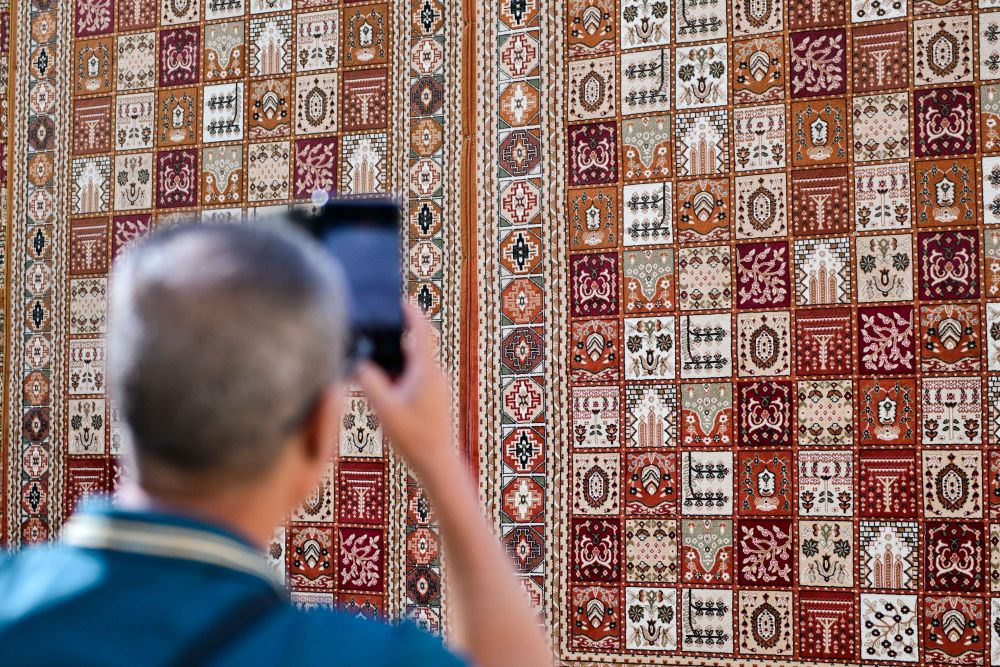 步入龜茲小巷,一幅巨大的地毯墻首先映入眼簾,地毯上大大小小的方格整齊排列,圖案精美對(duì)稱(chēng)、色彩艷麗。地毯是新疆少數(shù)民族家庭中最常見(jiàn)的裝飾品,一般以羊毛剪裁編織而成,集繪畫(huà)、雕刻、編織、刺繡、印染等手工技藝于一體,是展現(xiàn)新疆民族風(fēng)情的典型物品之一。