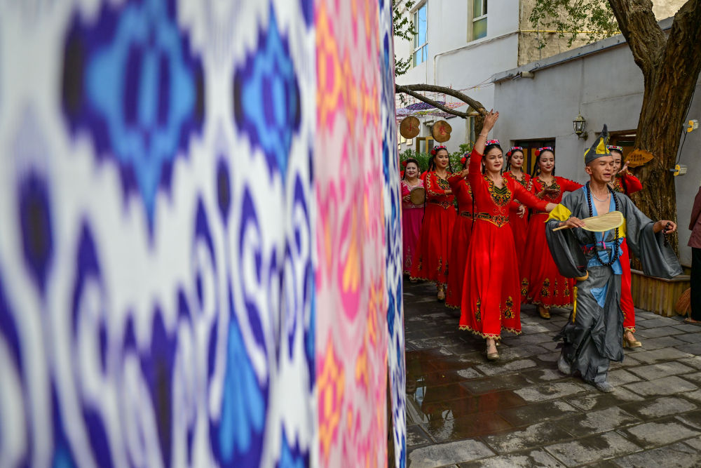 在新疆庫(kù)車(chē)市龜茲小巷,樂(lè)舞表演團(tuán)隊(duì)在小巷巡演。新華社記者 丁磊 攝