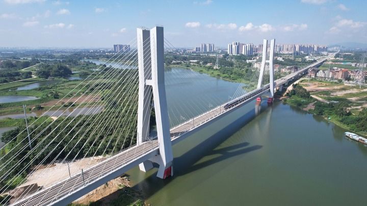 2023年9月26日,廣汕高鐵正式開通運營,列車經(jīng)過位于廣州市增城區(qū)的廣汕高鐵增江特大橋(無人機(jī)照片)。新華社記者 田建川 攝