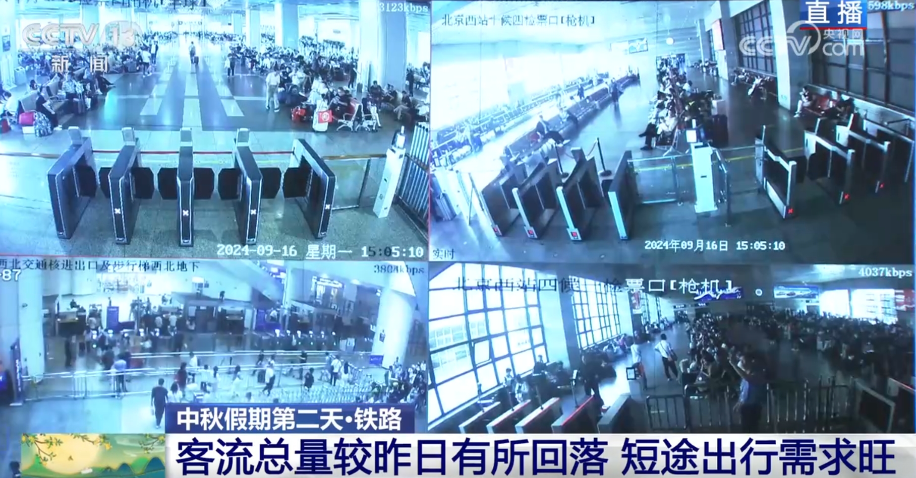 9月16日是中秋假期的第二天,哪些地方是大家的熱門出游地?先來看看鐵路出行。16日,鐵路出行客流以短途探親客流為主,預(yù)計發(fā)送旅客1180萬人次。16日鐵路短途出行需求旺盛,詳細(xì)情況,我們馬上連線正在國鐵集團(tuán)運(yùn)輸調(diào)度指揮大廳采訪的總臺央視記者楊麗君。
