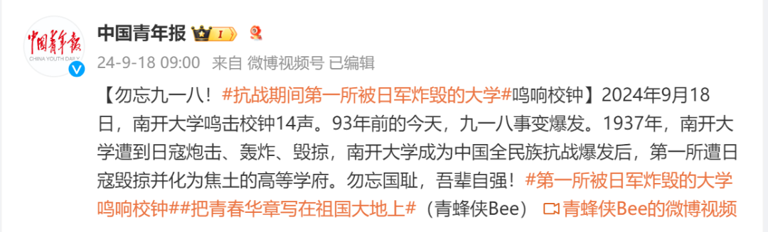 今天是九一八事變爆發(fā)93周年,南開大學(xué)鳴擊校鐘14聲。