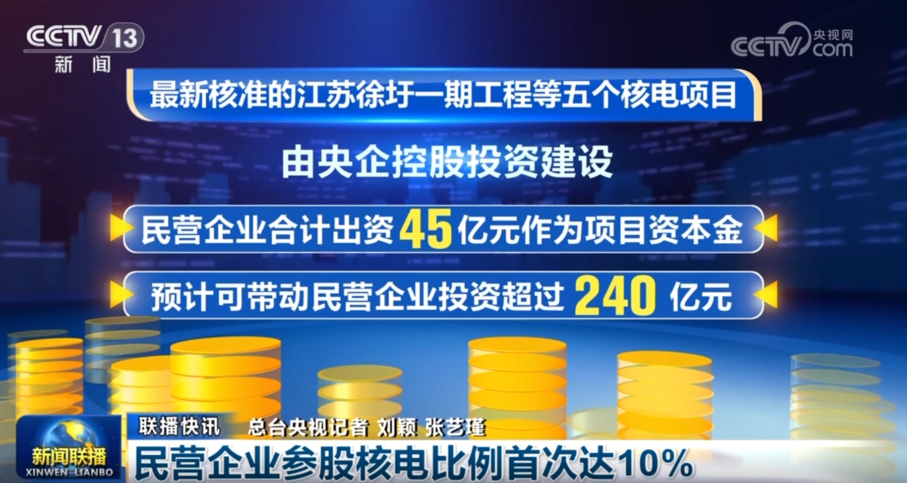 記者從國家發(fā)展改革委了解到,近期國務院核準的江蘇徐圩一期工程等五個核電項目,由央企控股投資建設,民營企業(yè)合計出資45億元作為項目資本金,預計可帶動民營企業(yè)投資超過240億元。民營企業(yè)參股核電的比例首次提高到了10%,核電領域進一步向民資放開。