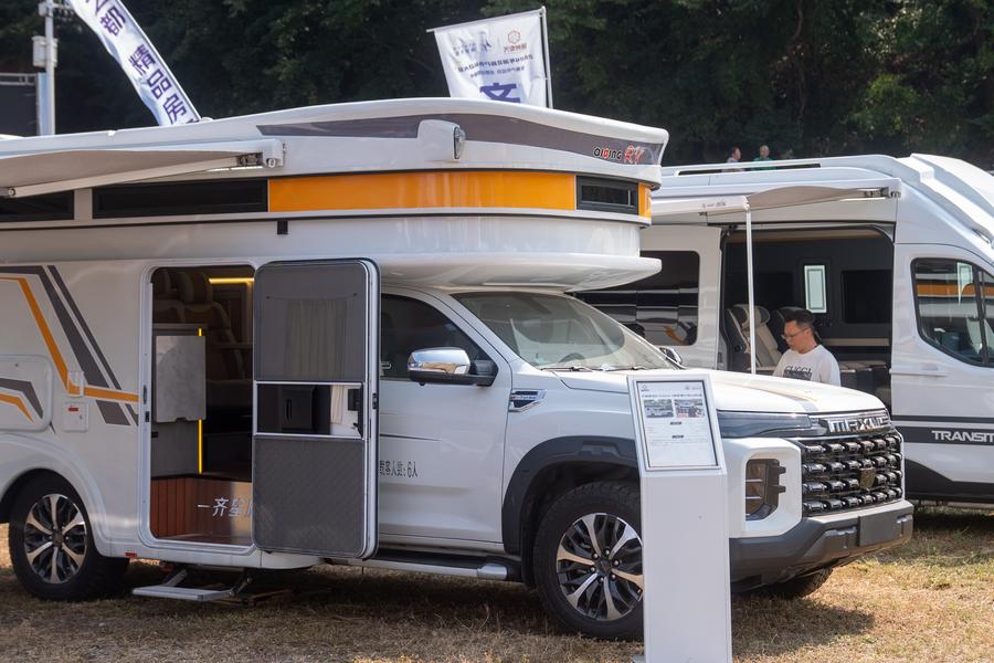 9月28日,參觀者在戶外運(yùn)動(dòng)裝備展上參觀房車。新華社記者 杜子璇 攝