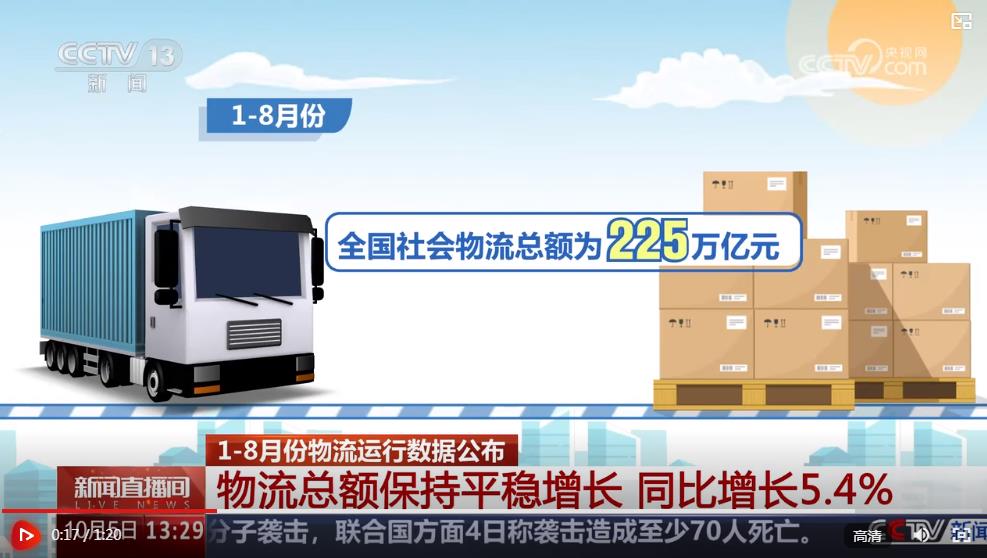 央視網(wǎng)消息:中國(guó)物流與采購(gòu)聯(lián)合會(huì)10月5日公布今年1至8月份物流運(yùn)行數(shù)據(jù)。數(shù)據(jù)顯示,8月份社會(huì)物流運(yùn)行總體穩(wěn)定,社會(huì)物流總額累計(jì)保持5%以上的穩(wěn)定增長(zhǎng)。