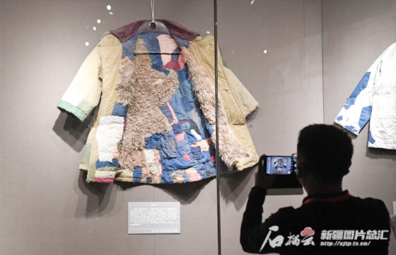 9月22日,游客在一件有著296塊補(bǔ)丁的軍大衣前駐足拍攝。(資料圖)石榴云/新疆日報(bào)記者 湯永攝