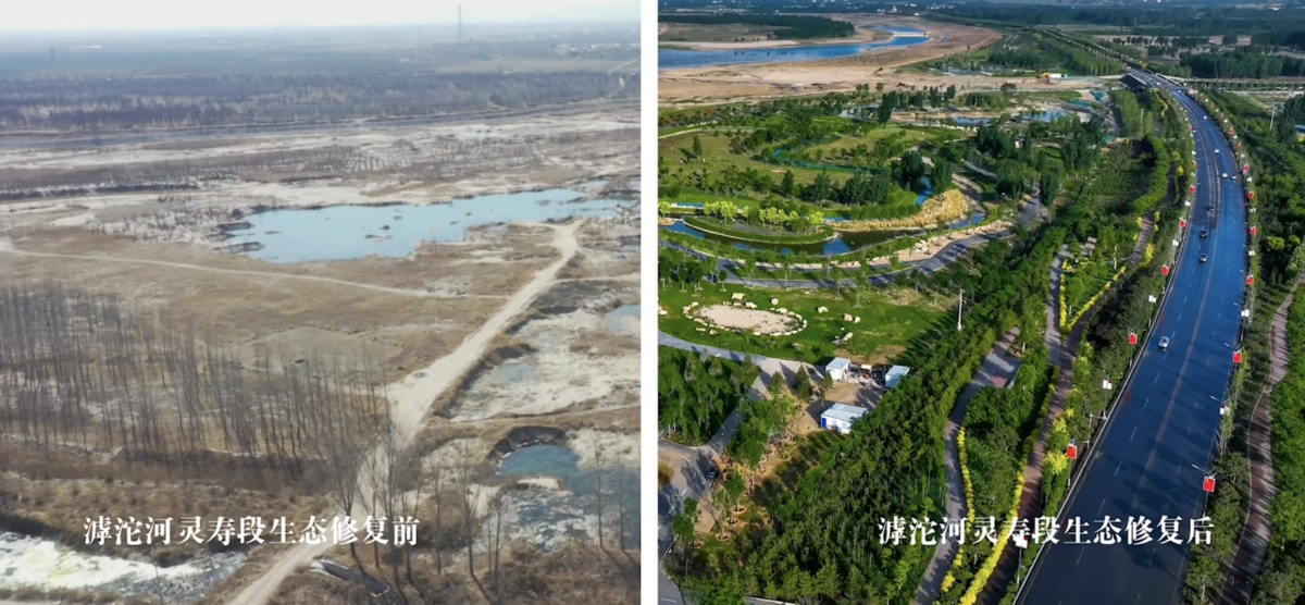 滹沱河靈壽段生態(tài)修復(fù)前后對比圖。(石家莊市水利局 供圖 )