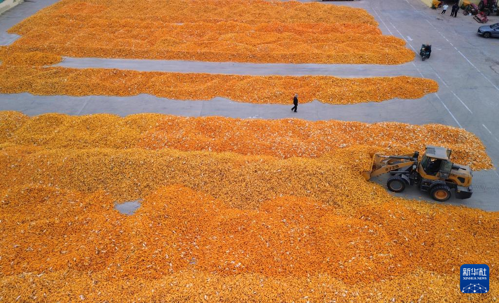 10月9日,在山東省臨邑縣德平鎮(zhèn),農(nóng)戶(hù)在晾曬剛收獲的玉米(無(wú)人機(jī)照片)。新華社記者 徐速繪 攝