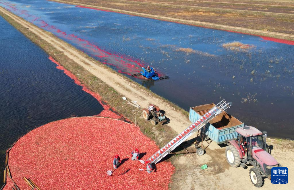 10月4日,在黑龍江省撫遠(yuǎn)市蔓越莓種植基地,工人在水中采收蔓越莓(無(wú)人機(jī)照片)。新華社發(fā)(李擁軍攝)