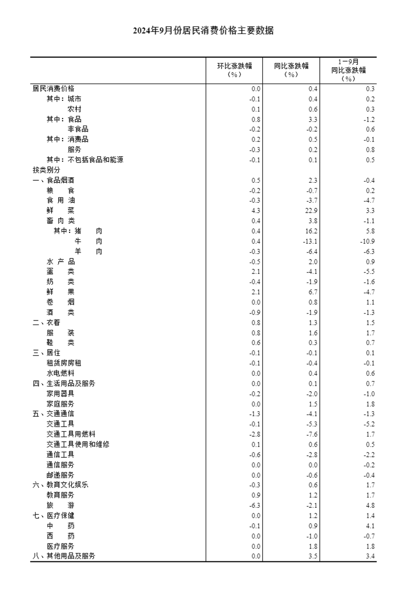 2024年9月份,全國居民消費價格同比上漲0.4%。其中,城市上漲0.4%,農村上漲0.6%;食品價格上漲3.3%,非食品價格下降0.2%;消費品價格上漲0.5%,服務價格上漲0.2%。1—9月平均,全國居民消費價格比上年同期上漲0.3%。