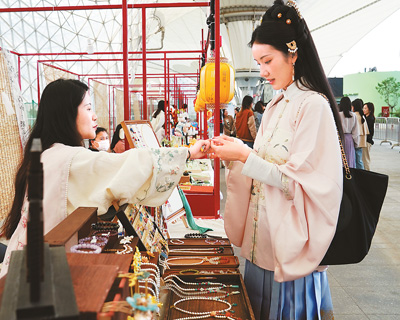 華服愛好者在二〇二四年“中國華服周·滬上繁花”國風(fēng)市集上挑選飾品。新華社記者 劉穎攝