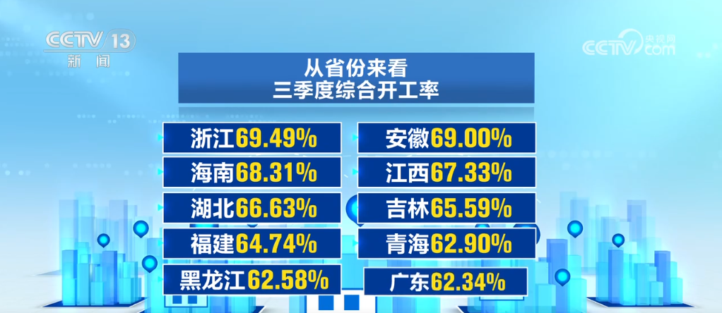 從省份來看,三季度綜合開工率排名前十的有浙江、安徽、海南等,且開工率都在60%以上,工程建設(shè)熱情高漲。