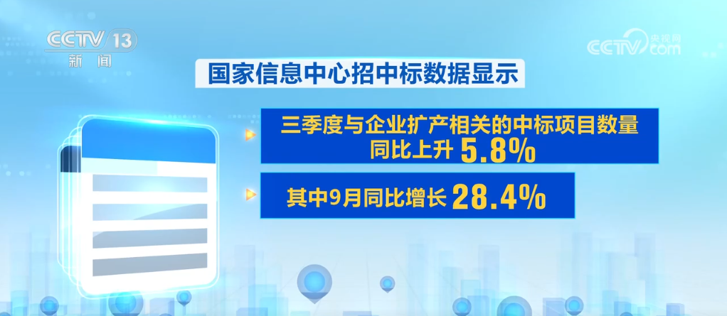 不僅工程建設(shè)在提速,作為項目落地的第一步,中標數(shù)據(jù)也在快速增長。國家信息中心招中標數(shù)據(jù)顯示,三季度與企業(yè)擴產(chǎn)相關(guān)的中標項目數(shù)量同比上升5.8%,其中9月同比增長28.4%,為今年以來最高增速,企業(yè)擴產(chǎn)熱度回升明顯。