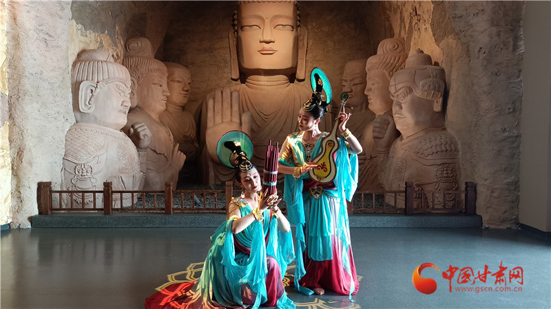 “我覺得你的舞蹈動作可以再柔和一點,再飄逸一點,要給人從壁畫中飛出來的那種感覺?!痹谖渫胁┪镳^天梯山仿真石窟展區(qū),付泓正在給排練西涼樂舞的舞蹈演員講要領(lǐng),他希望西涼樂舞可以像壁畫里飛出來的那樣,再現(xiàn)千年涼州的繁華。
