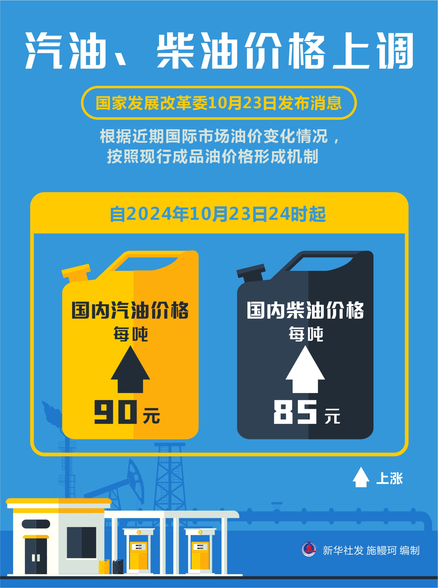 國家發(fā)展改革委23日發(fā)布消息,根據(jù)近期國際市場油價(jià)變化情況,按照現(xiàn)行成品油價(jià)格形成機(jī)制,自2024年10月23日24時(shí)起,國內(nèi)汽、柴油價(jià)格每噸分別上漲90元和85元。