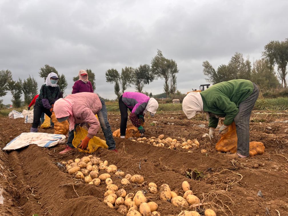 在甘肅省張掖市山丹縣甘農(nóng)薯7號綠色標準化連片示范基地里,村民正在撿收馬鈴薯。(受訪者供圖)
