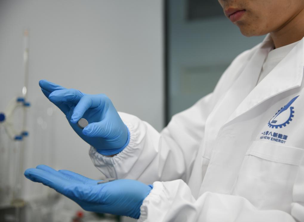 西安一九零八新能源科技有限公司科研人員在展示由其研發(fā)的復雜金屬基復合固態(tài)儲氫材料。新華社記者 張博文 攝