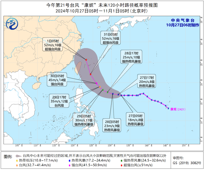 預計,“康妮”將以每小時10至15公里的速度向偏西方向移動。29日開始轉(zhuǎn)向西北方向移動,逐漸向臺灣島東部海面靠近,強度逐漸增強,最強可達強臺風級或超強臺風級(48至55米/秒,15至16級)。