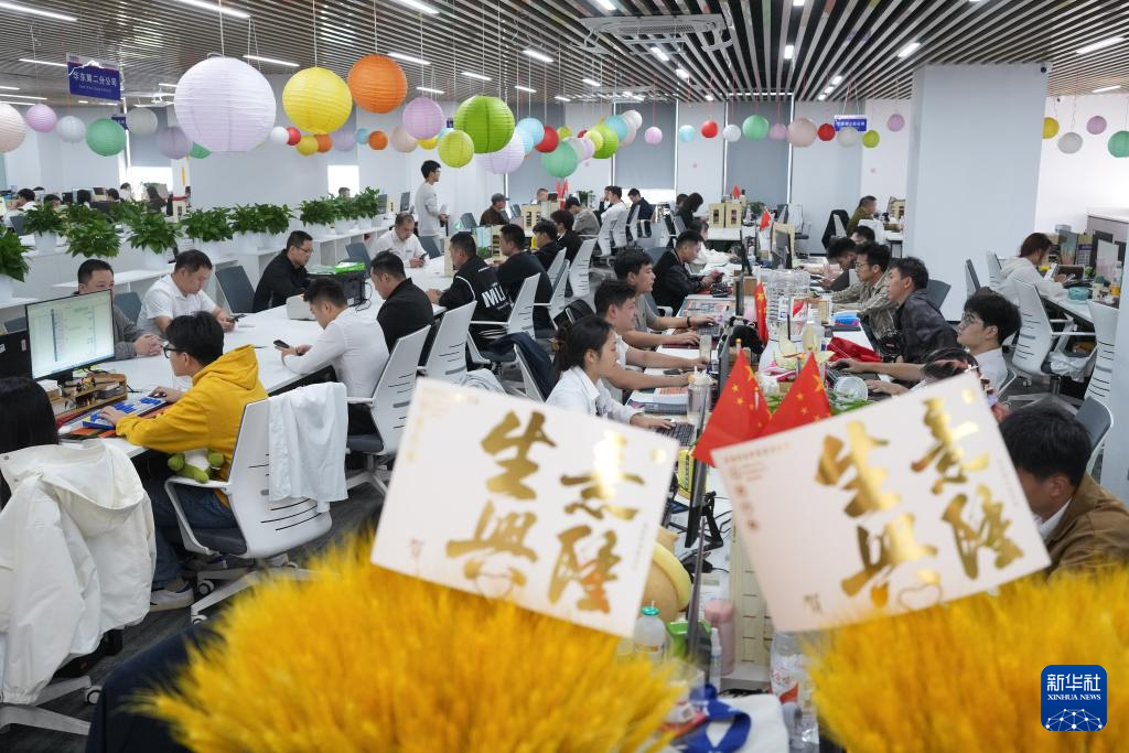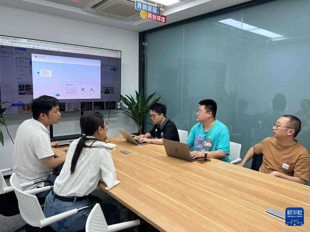 Chinagoods AI智創(chuàng)服務(wù)平臺的技術(shù)人員在討論一款新產(chǎn)品的設(shè)計(jì)(5月17日攝)。新華社發(fā)