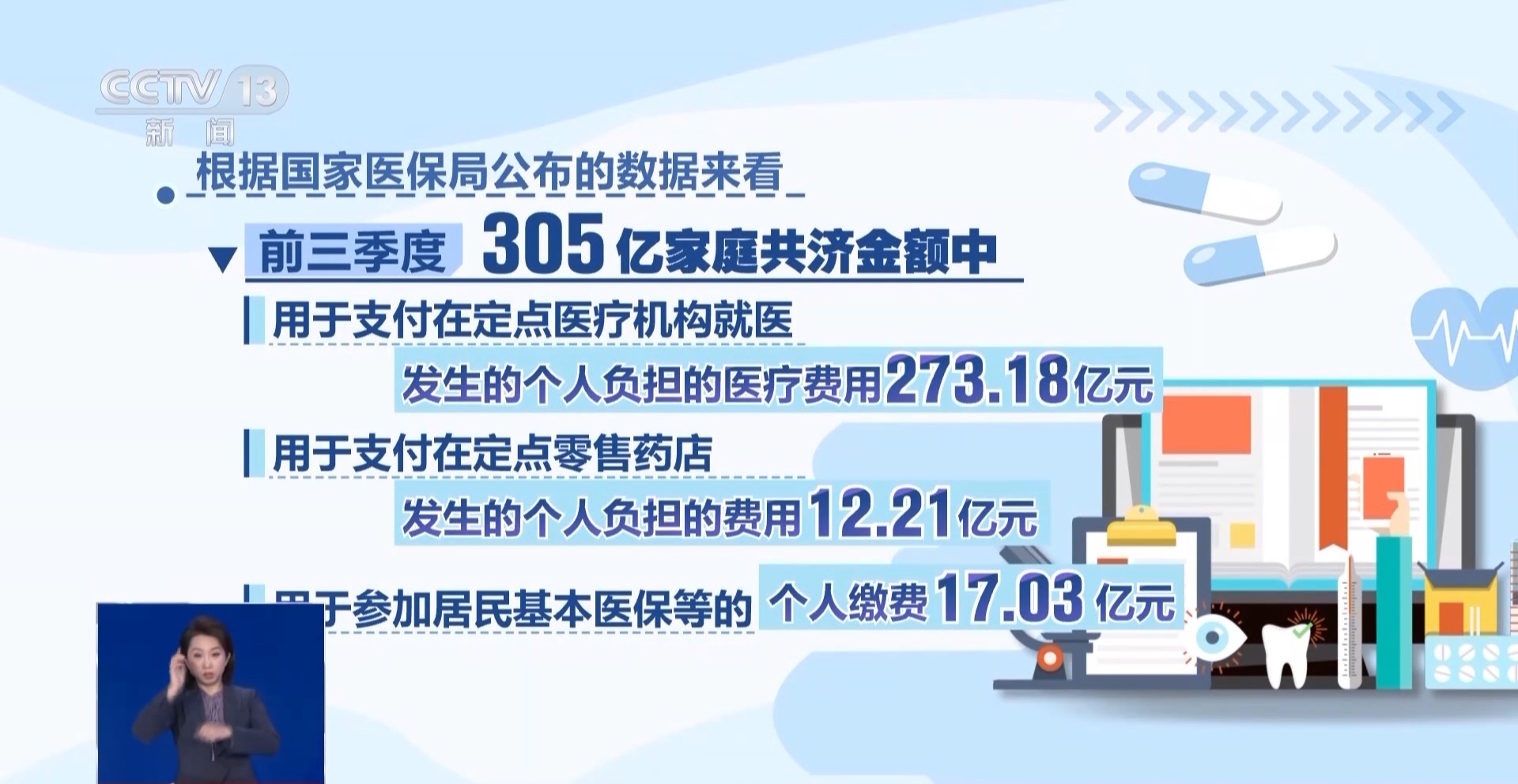 根據(jù)國家醫(yī)保局公布的數(shù)據(jù)來看,前三季度的305億家庭共濟(jì)金額中,用于支付在定點(diǎn)醫(yī)療機(jī)構(gòu)就醫(yī)發(fā)生的個(gè)人負(fù)擔(dān)的醫(yī)療費(fèi)用273.18億元,用于支付在定點(diǎn)零售藥店發(fā)生的個(gè)人負(fù)擔(dān)的費(fèi)用12.21億元,用于參加居民基本醫(yī)保等的個(gè)人繳費(fèi)17.03億元。