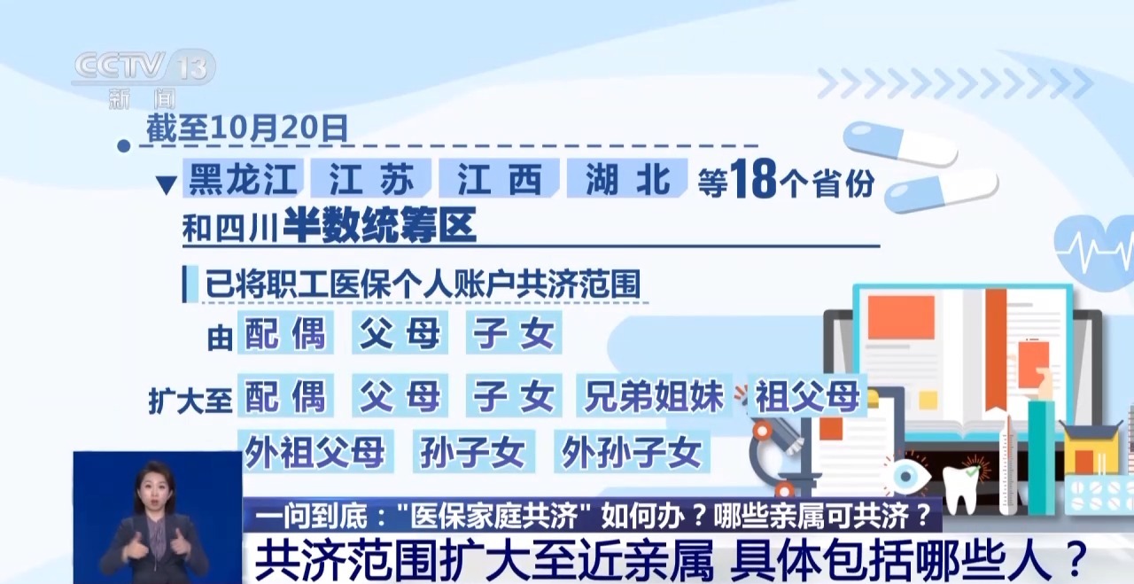 截至10月20日,黑龍江、江蘇、江西、湖北等18個(gè)省份及四川半數(shù)統(tǒng)籌區(qū)已將職工醫(yī)保個(gè)人賬戶共濟(jì)范圍由“配偶、父母、子女”擴(kuò)大至“配偶、父母、子女、兄弟姐妹、祖父母、外祖父母、孫子女、外孫子女”。