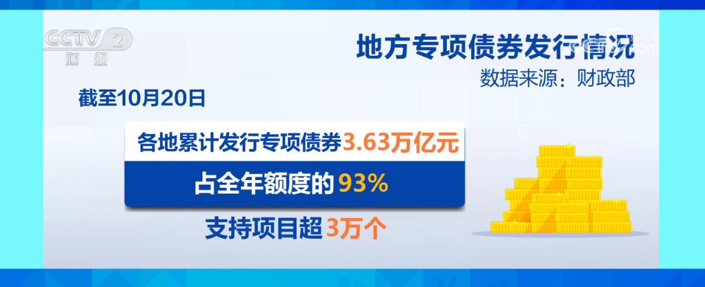 數(shù)據(jù)顯示,9月份,全國一般公共預(yù)算支出、政府性基金預(yù)算支出同比分別增長5.2%和34.2%。同時,地方專項債券發(fā)行加速,9月發(fā)行約占全年額度的26%。截至10月20日,各地累計發(fā)行專項債券3.63萬億元,占全年額度的93%,支持項目超3萬個。