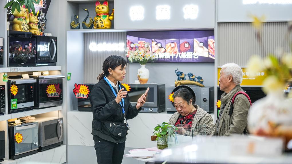 銷售人員在向貴陽(yáng)市民推介以舊換新商品(10月11日攝)。新華社記者 陶亮 攝