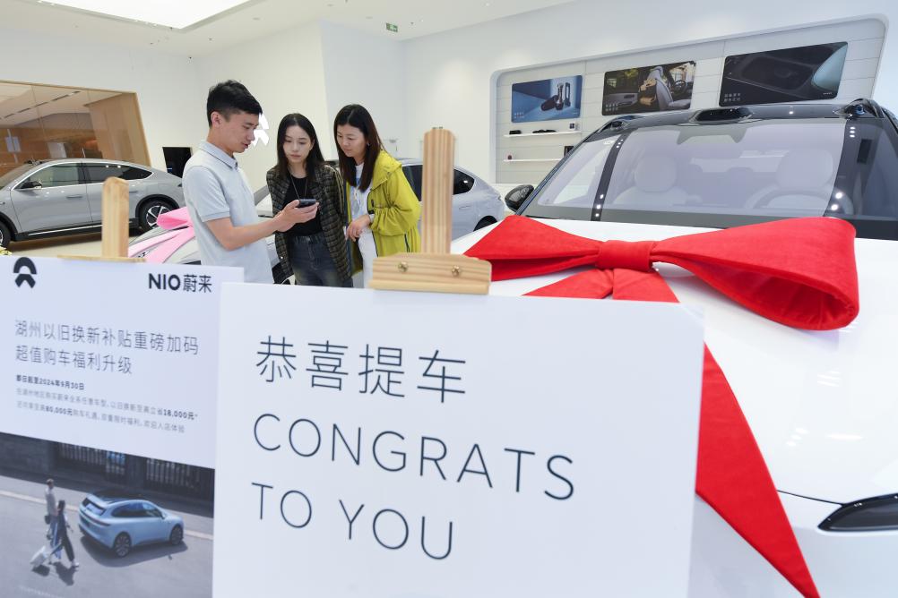 9月24日,在位于湖州市湖東街道的蔚來(lái)交付中心,銷售人員向顧客介紹提車后如何申領(lǐng)以舊換新補(bǔ)貼。新華社記者 翁忻旸 攝