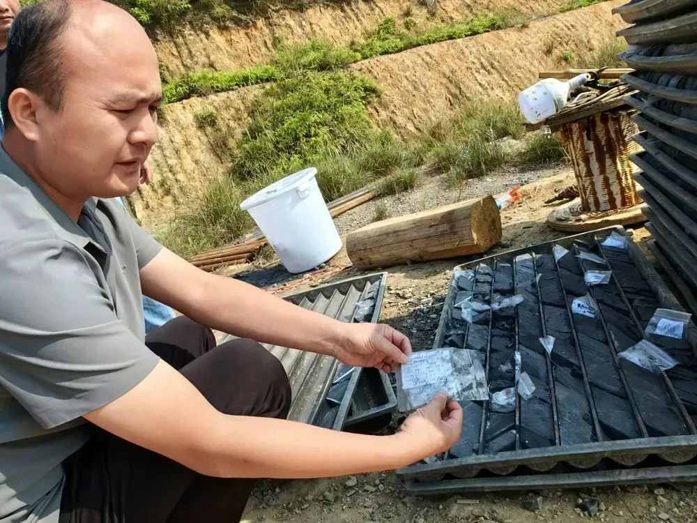 技術人員展示鉆探新發(fā)現(xiàn)的碳酸錳礦石。新華社記者 蘇曉洲 攝