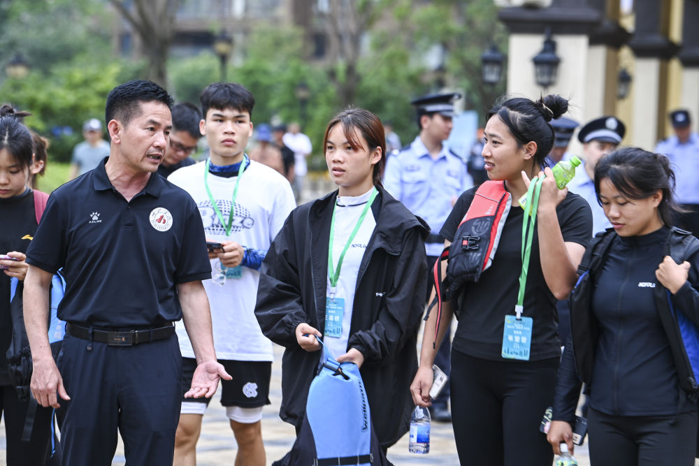 在廣西“潮動三月三·民族體育炫”系列賽期間,藍建卓與隊員們交流。