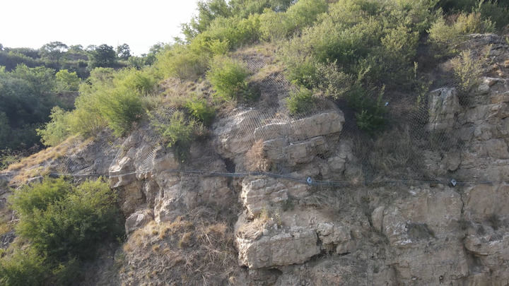 為防止碎石脫落將古棧道掩埋或毀壞,近幾年國家出資對此處棧道上的危巖體進(jìn)行加固。目前工程已竣工,古棧道上方有專業(yè)防護(hù)網(wǎng),新修的排水溝阻斷了上方雨水對古棧道的沖刷。