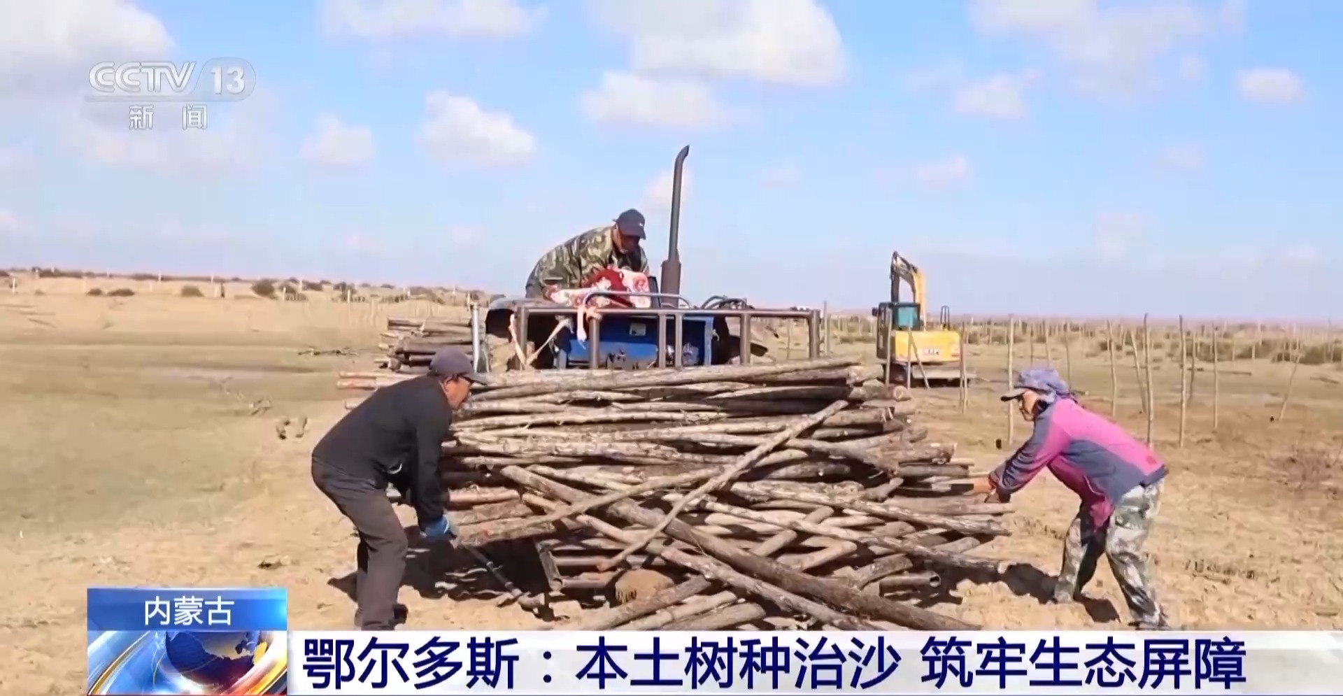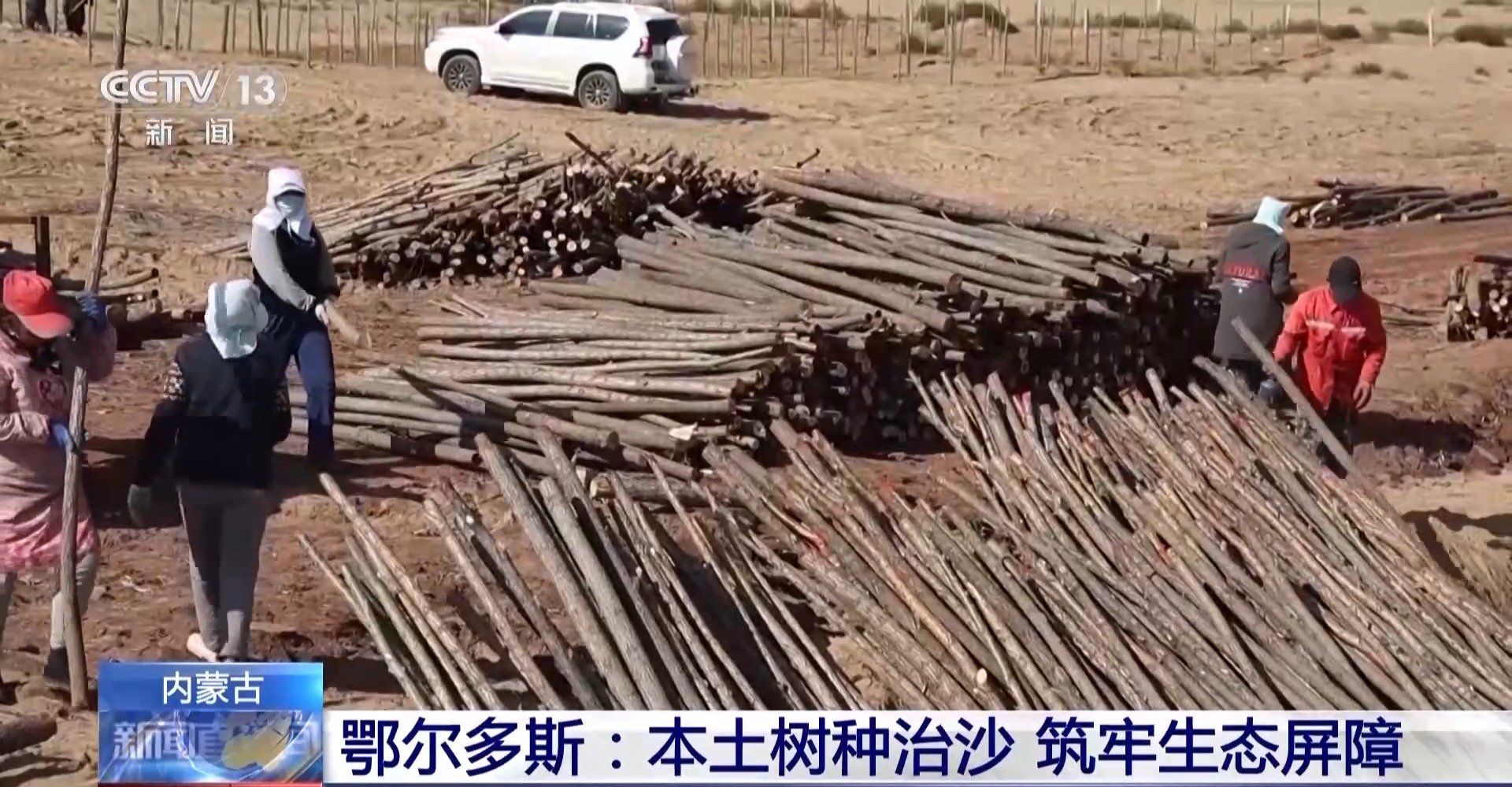 烏審旗某植樹造林項目經(jīng)理 何瑞東:旱柳苗木是從烏審旗周邊農(nóng)牧民自己家的柳樹進回來的,有效地提高當(dāng)?shù)啬撩竦囊徊糠质杖?。我們?yán)格收料,控制苗木的高度、胸徑,以及苗木質(zhì)量。苗木運來后要充分泡苗,充分地讓旱柳把水分吸收,開始要根部蘸漿,蘸一種肥料,促進根部發(fā)育,然后用到施工現(xiàn)場。