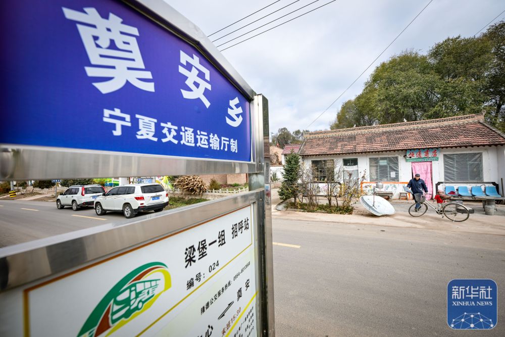 11月9日,一輛載有乘客和快遞物品的公交車從隆德縣城駛出(無人機照片)。
