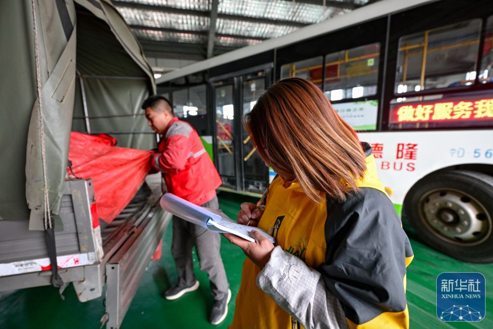 11月9日,一家物流企業(yè)將快遞運至隆德縣公交公司倉庫,工作人員(右)在登記快遞信息。