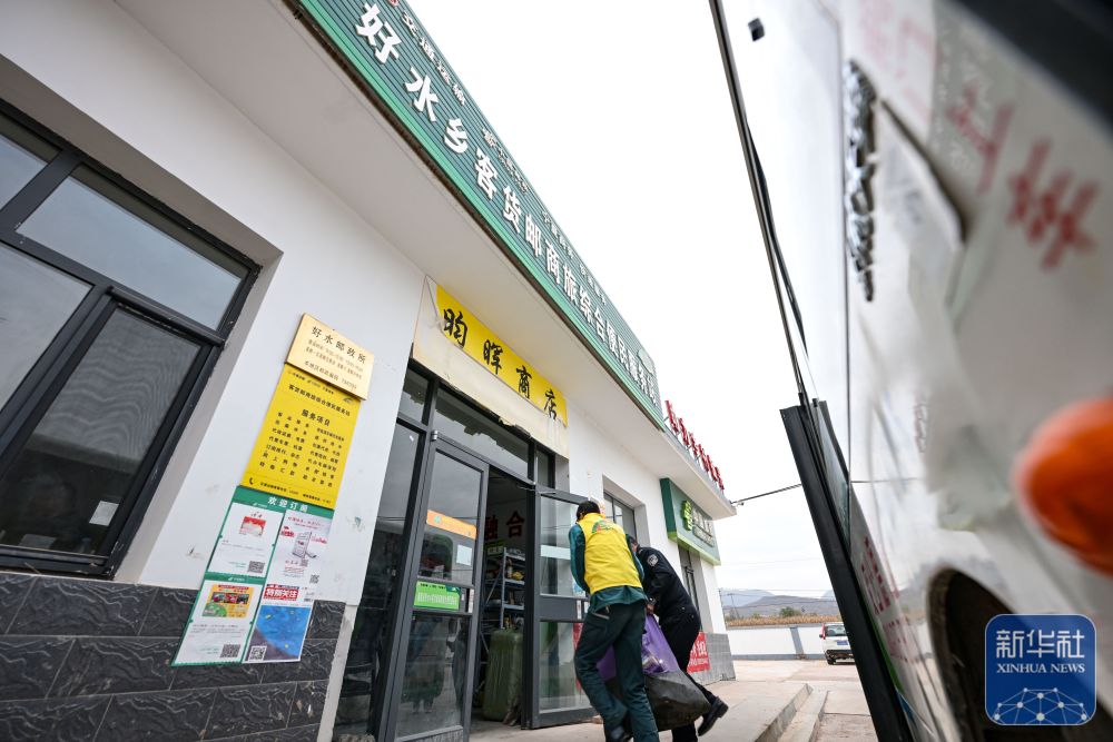 11月9日,隆德縣公交車司機和好水鄉(xiāng)客貨郵商旅綜合便民服務(wù)站經(jīng)營者從公交車上卸下快遞物品。