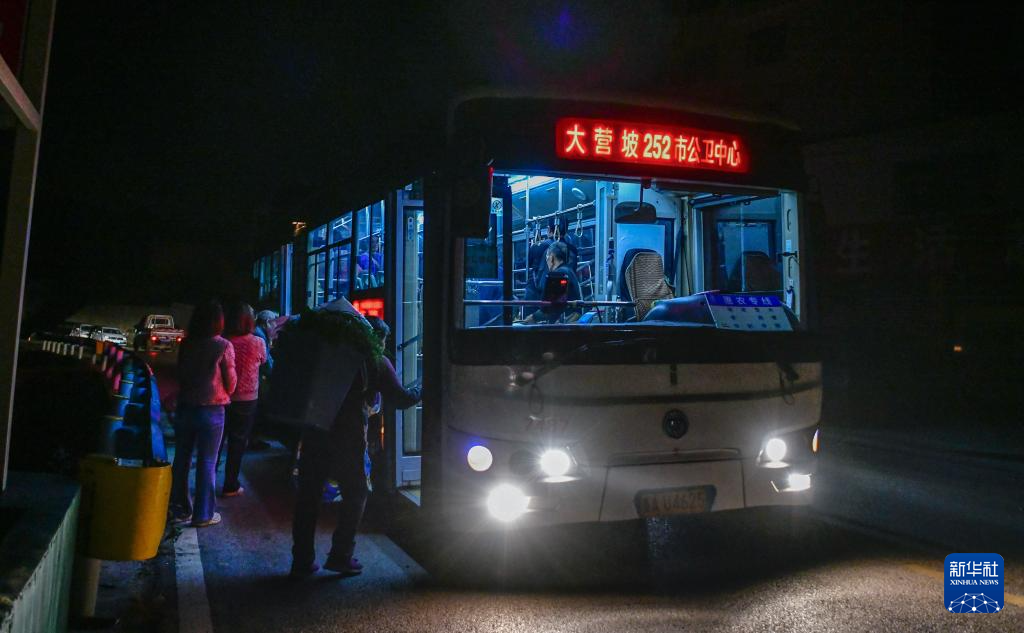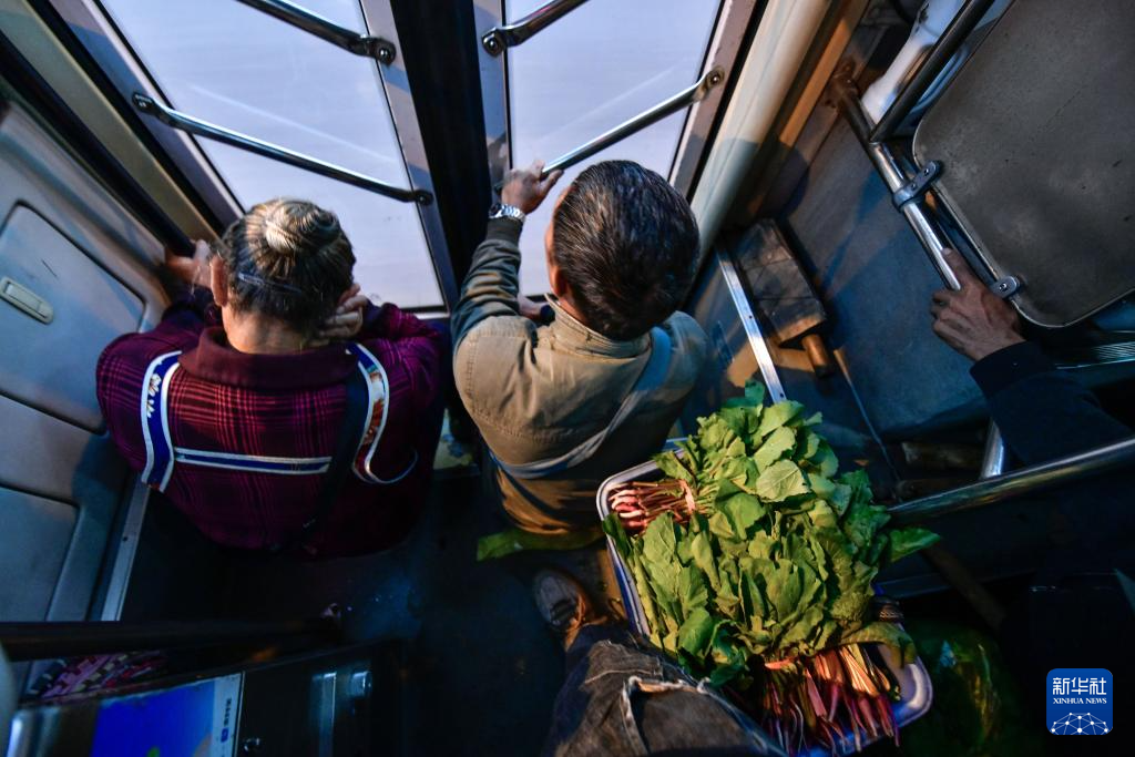 在貴陽市烏當(dāng)區(qū)水田鎮(zhèn)定扒村,菜農(nóng)乘坐252路“惠農(nóng)專線”公交車,準(zhǔn)備進(jìn)城賣菜(11月7日攝)。