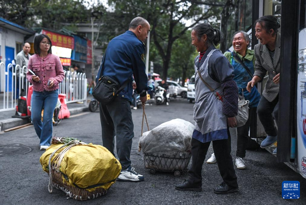菜農(nóng)乘坐252路“惠農(nóng)專線”公交車抵達(dá)貴陽市大營坡終點(diǎn)站下車時(shí)與搭手幫忙的駕駛員交談(11月7日攝)。