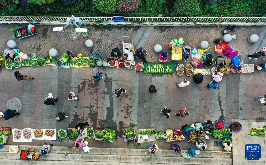 11月11日,市民在貴陽市大營坡附近選購“惠農(nóng)專線”公交車運(yùn)送來的新鮮農(nóng)產(chǎn)品(無人機(jī)照片)。