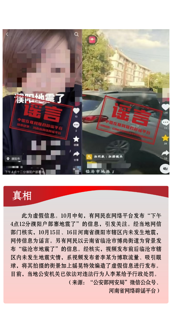 危言聳聽炒作話題。個別網(wǎng)民和自媒體編造虛假信息,炒作社會熱點(diǎn)話題,并配以具有煽動性、誤導(dǎo)性的標(biāo)題,擴(kuò)散傳播,擾亂社會秩序。10月中旬,新疆喀什、阿克蘇地區(qū)相繼發(fā)生地震,部分自媒體罔顧事實,利用AI技術(shù)拼湊網(wǎng)絡(luò)舊圖,編造完全與事實不符的地震廢墟或災(zāi)后救援圖片,混淆視聽,嚴(yán)重誤導(dǎo)網(wǎng)民。另有個別網(wǎng)民將拍攝的街景加上搖晃特效,惡意杜撰云南發(fā)生地震,引發(fā)公眾恐慌,造成不良影響。還有網(wǎng)民為給網(wǎng)店營銷引流,利用家長們高度關(guān)注兒童安全話題的心理,無中生有編造“四川巴中頻繁有青少年失蹤”謠言,引發(fā)公眾焦慮恐慌。