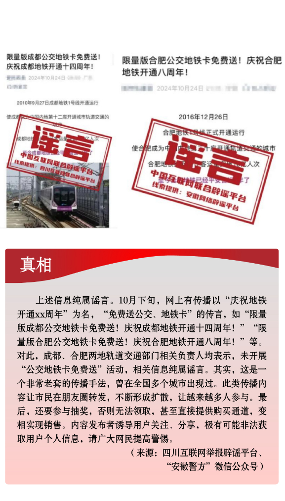 假冒官方虛構(gòu)政策。一些不法分子冒充權(quán)威機(jī)構(gòu),散布涉公共政策類謠言,誤導(dǎo)公眾認(rèn)知。有的假借官方名義,偽造政策文件,實則行騙牟利,侵犯群眾利益。如有人利用公眾對“大數(shù)據(jù)”“數(shù)字經(jīng)濟(jì)”等內(nèi)容的認(rèn)知盲區(qū),假借“國家數(shù)據(jù)局”“中國人民銀行數(shù)字貨幣研究所”等官方名義,偽造政策文件,謠稱“國家數(shù)據(jù)局頒發(fā)‘個人數(shù)據(jù)資產(chǎn)擁有權(quán)確權(quán)憑證’”“數(shù)字人民幣平臺將發(fā)放‘?dāng)?shù)字資產(chǎn)紅利’”,相關(guān)部門均已發(fā)布辟謠聲明。有的從公開發(fā)布的政策信息中摘取碎片化信息,斷章取義,對政策歪曲解讀。如個別自媒體故意混淆“個人養(yǎng)老金”與“基本養(yǎng)老金”的概念,傳播“領(lǐng)取養(yǎng)老金要繳3%個稅”“養(yǎng)老金個稅起征點(diǎn)為5000元”等不實信息,引發(fā)公眾誤解。另有“成都、合肥等地免費(fèi)送公交地鐵卡”謠言,以“免費(fèi)”“贈送”為噱頭,誘導(dǎo)用戶關(guān)注、分享,最終可能導(dǎo)致用戶遭受個人信息泄露或其他不法侵害。