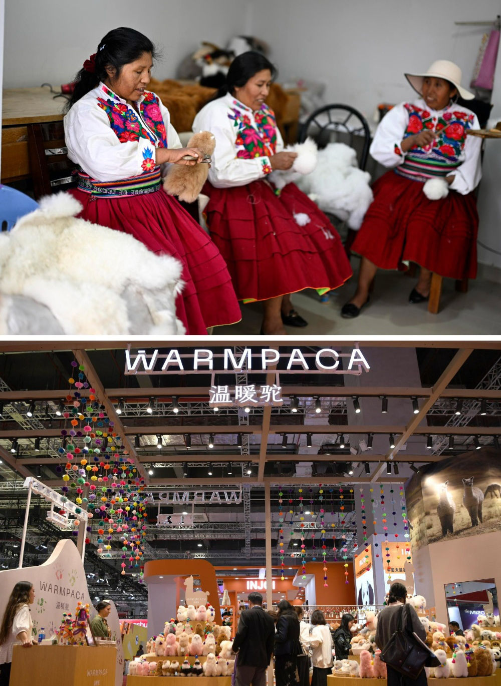 2016年,中國姑娘馬玉霞在秘魯阿雷基帕街邊市場(chǎng)購買了秘魯羊駝毛制品手工藝人奧斯瓦爾多·馬馬尼的羊駝毛玩偶并引入中國市場(chǎng)。通過連續(xù)參展進(jìn)博會(huì),羊駝毛制品在中國市場(chǎng)大受歡迎,并創(chuàng)立了中文品牌“溫暖駝”。今年,秘魯品牌“溫暖駝”連續(xù)第七年亮相進(jìn)博會(huì),受到更多中國消費(fèi)者的喜愛。目前,“溫暖駝”品牌已入駐國內(nèi)30多家商場(chǎng),并且開拓了電商平臺(tái)線上銷售,年銷量超過3萬只。上圖:2024年6月20日,在秘魯阿雷基帕,工作人員在羊駝毛制品手工藝人奧斯瓦爾多·馬馬尼的工坊制作羊駝玩偶。下圖:2024年11月5日在上海拍攝的第七屆進(jìn)博會(huì)秘魯“溫暖駝”展臺(tái)。