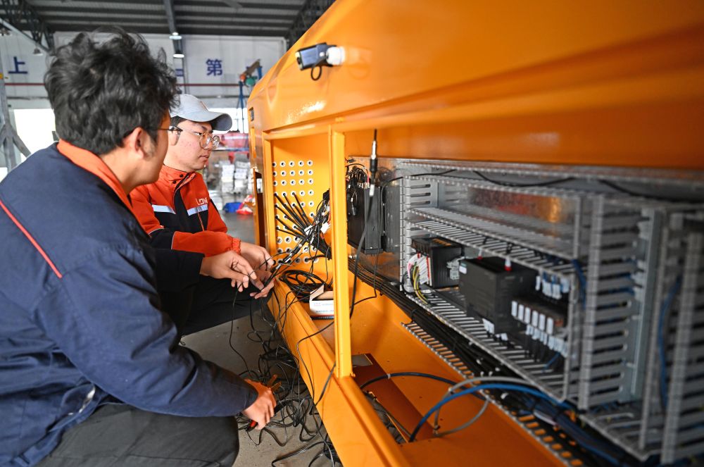 在位于天津市西青區(qū)的天津朗譽(yù)機(jī)器人有限公司生產(chǎn)車間內(nèi),工作人員在調(diào)試重載自動(dòng)導(dǎo)引運(yùn)輸車。新華社記者 趙子碩 攝