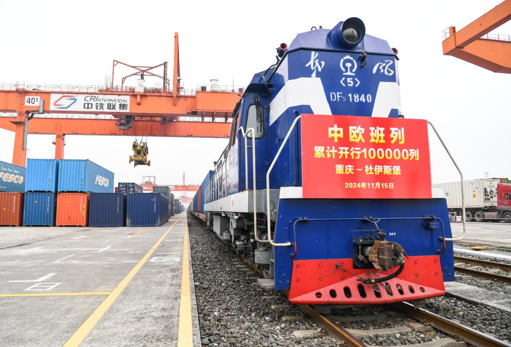 11月15日,第10萬(wàn)列中歐班列——X8083次中歐班列(重慶—杜伊斯堡)在重慶團(tuán)結(jié)村中心站準(zhǔn)備發(fā)車。新華社記者 王全超 攝