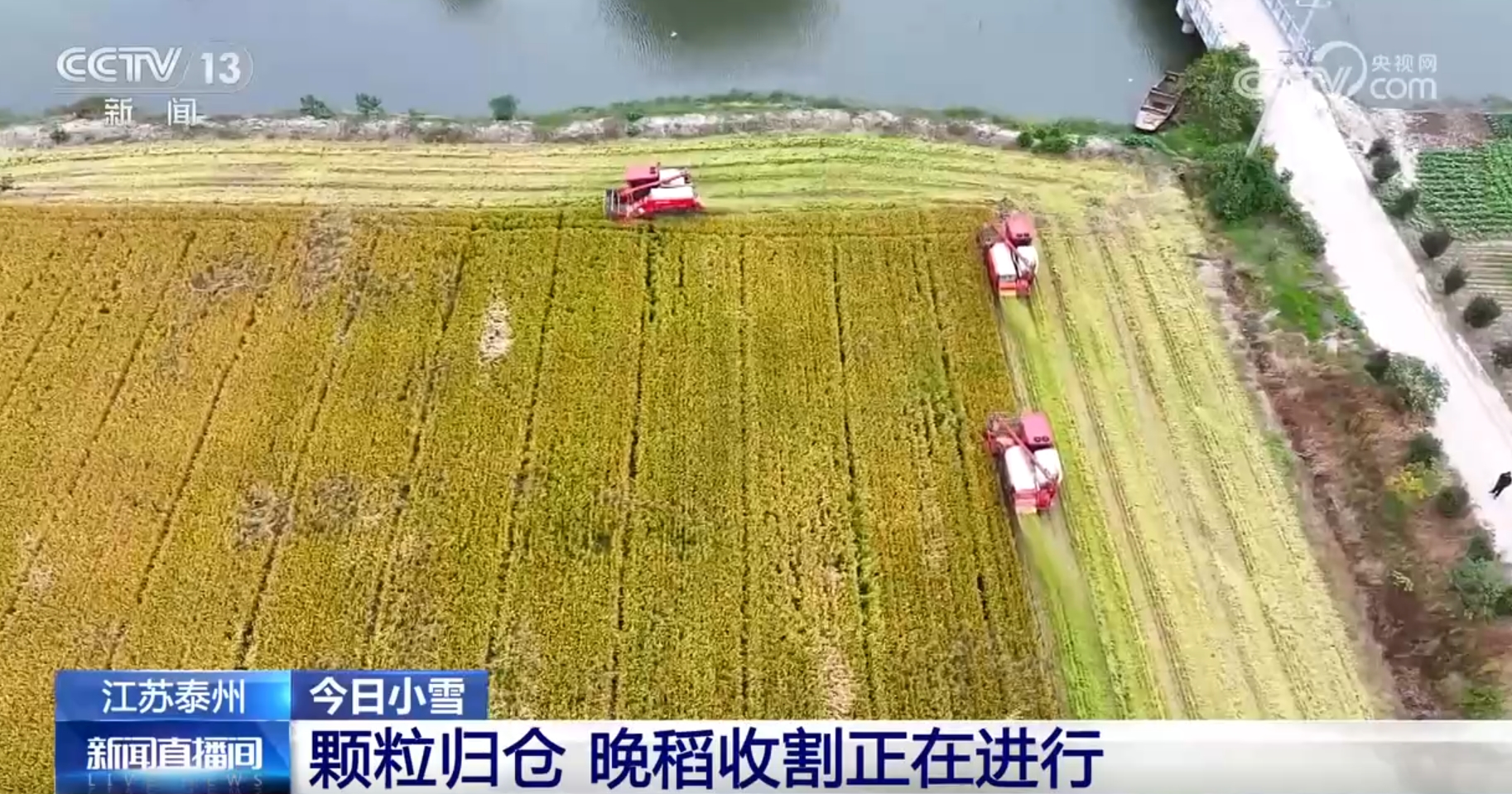 我們現(xiàn)在看到的是江蘇泰州正在進行的晚稻收割作業(yè)。這個時候,當(dāng)?shù)卦绲竞椭械疽呀?jīng)收獲完成,收割機正開足馬力進行晚稻收獲,割穗、脫粒、粉碎秸稈,一氣呵成,連倒伏的稻穗也被采收干凈,金黃飽滿的稻谷順著管道傾瀉而下,顆粒歸倉。