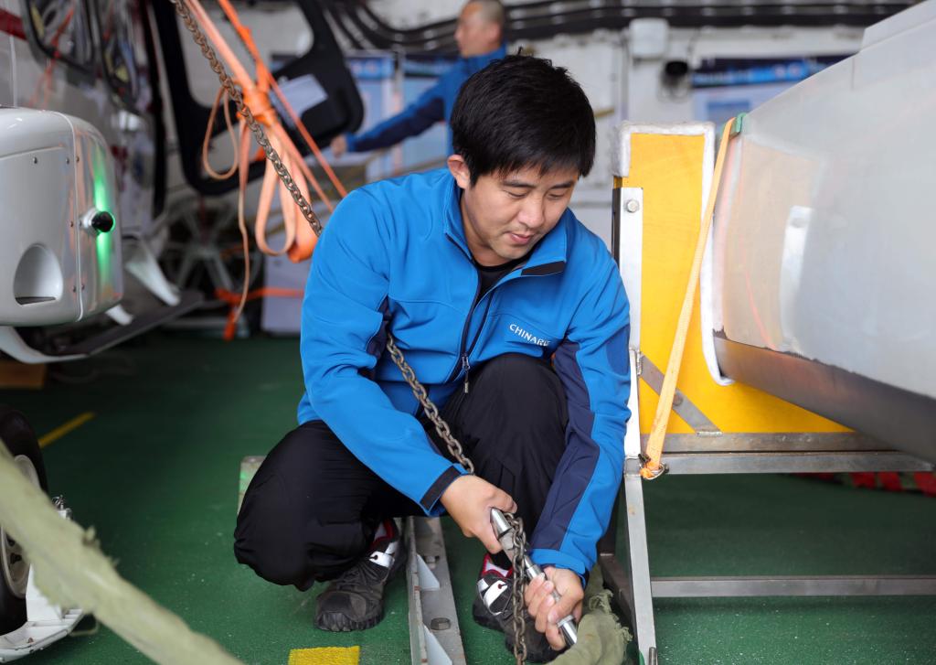 執(zhí)行中國第41次南極考察任務(wù)的“雪龍”號和“雪龍2”號于北京時間2024年11月19日開始穿越“咆哮”西風帶。這是“雪龍2”號直升機機組成員畢凌峰在擰緊直升機固定件。新華社記者黃韜銘攝