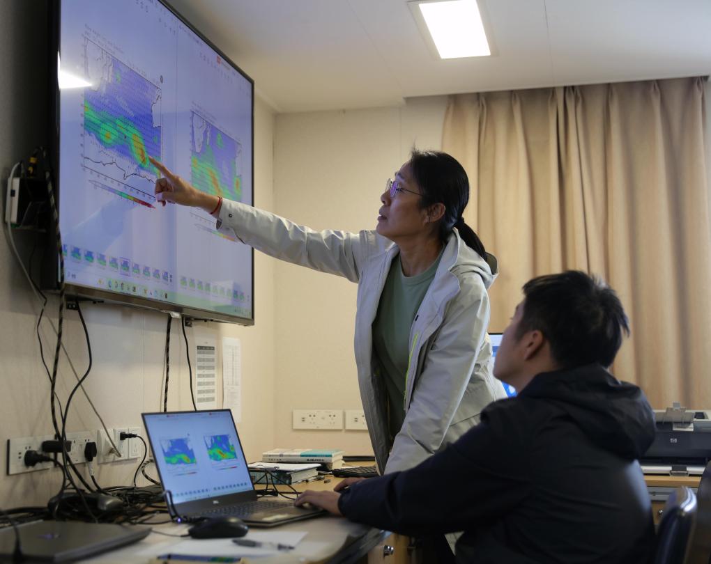 執(zhí)行中國第41次南極考察任務(wù)的“雪龍”號和“雪龍2”號于北京時間2024年11月19日開始穿越“咆哮”西風帶。這是“雪龍2”號隨船氣象保障員劉素芳(左)在研判天氣情況,規(guī)劃航行路線。新華社記者黃韜銘攝