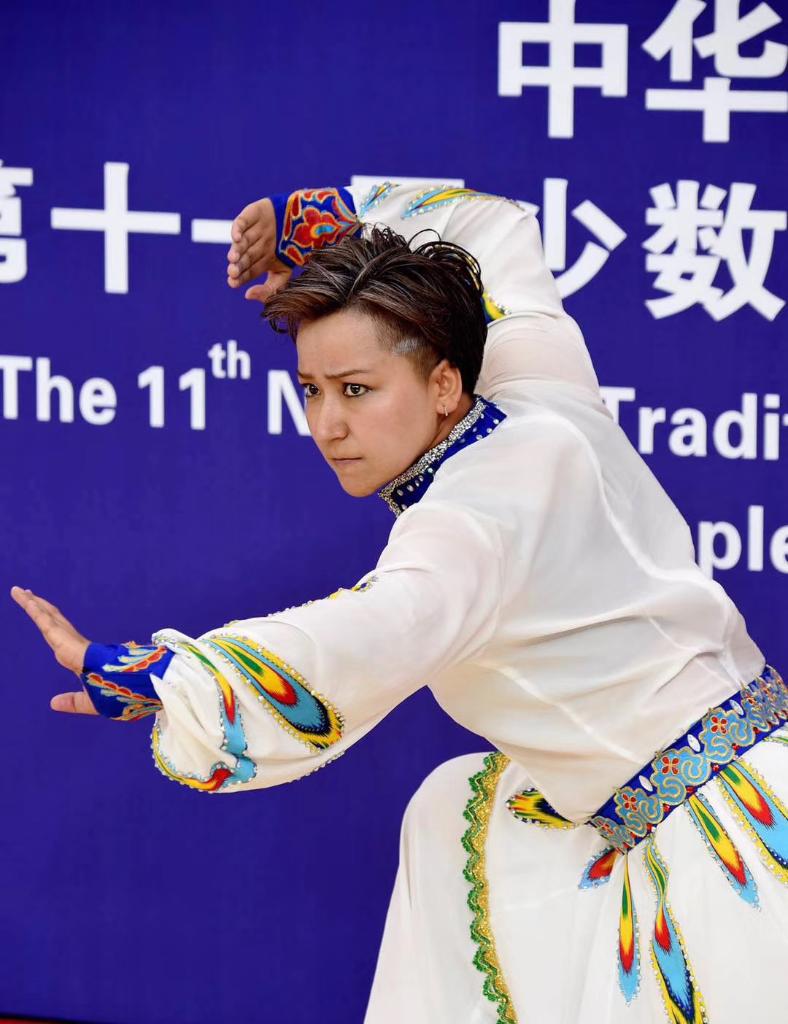 24日的第十二屆全國少數(shù)民族傳統(tǒng)體育運(yùn)動(dòng)會(huì)(以下簡稱“運(yùn)動(dòng)會(huì)”)民族武術(shù)項(xiàng)目賽場上,從小在烏魯木齊長大的她引發(fā)觀眾席一陣驚嘆。